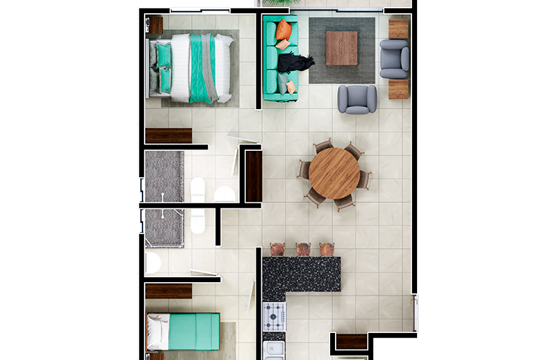 Departamento de playa con 80mts2, sala, cocina, comedor, 2 recámaras, 2 baños, terraza y área de lavado.